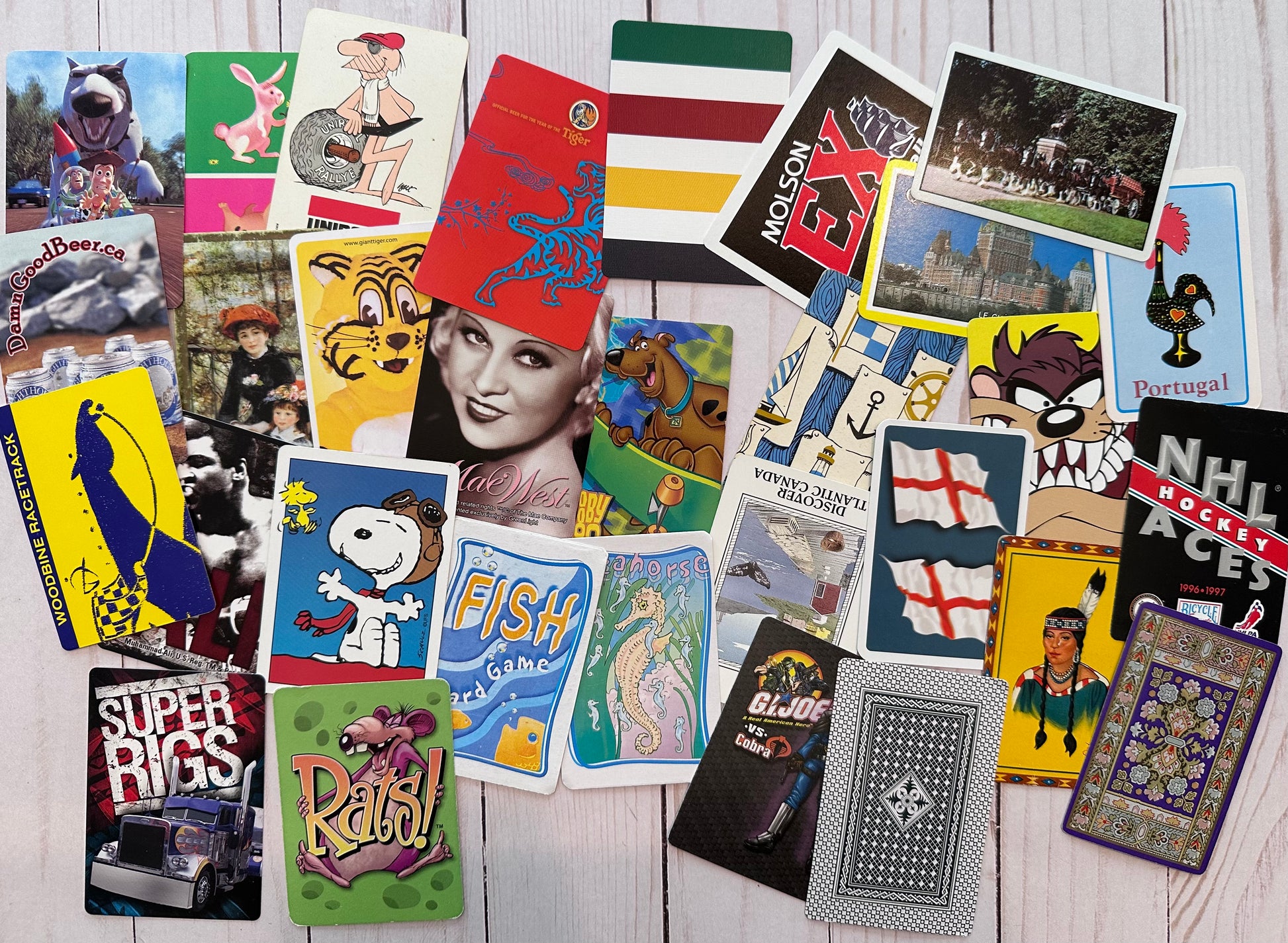 You'll get 15 designs of old playing cards in a variety of designs. No duplicates, when possible. Most are standard size 2.5x3.5". Some card sizes may vary slightly. There are some round cards, as well.