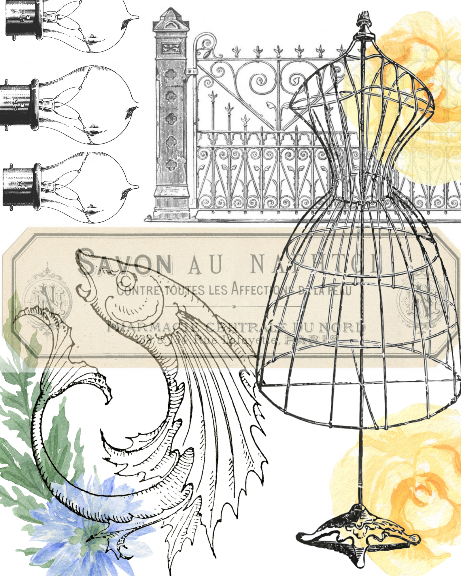 Vintage Dress Form with Light Bulbs & Fish Collage Printable 8X10"